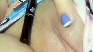 Hidden home camera under the table captures this plump wife fingering her big hairy pussy and saggy tits in a solo session
