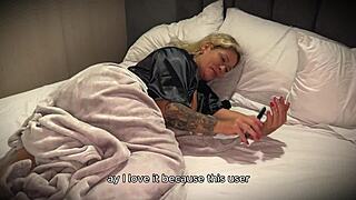Blonde beauty in red lipstick dress jerks boyfriend into condom