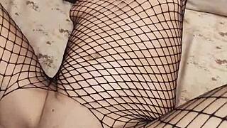 A wife in an erotic fishnet bodysuit beautifully spreads her legs